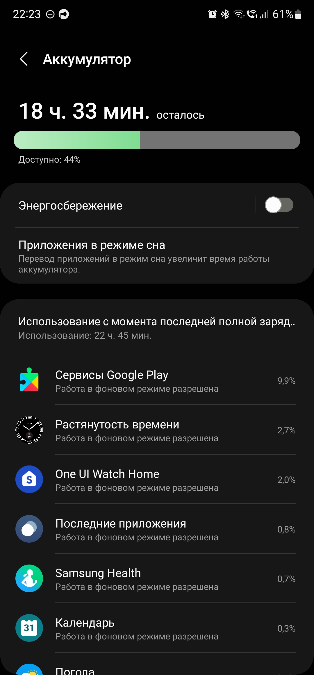 Обычно через сутки после зарядки часы показывали где-то 55-63% оставшегося заряда, так что мне после ночи их просто нужно было класть на зарядку где-то на 40 минут - меня такой режим полностью устраивает.