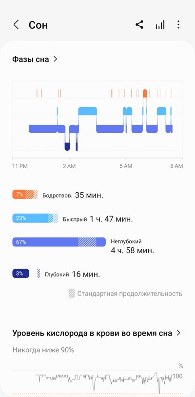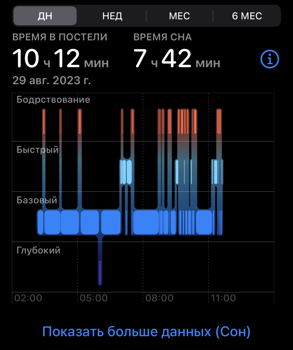 Можно также посмотреть фазы сна. Благодаря этой статистике я заметил, что повышенное потребление кофе и чая вечером у меня приводит к дефициту фазы голубого сна.