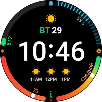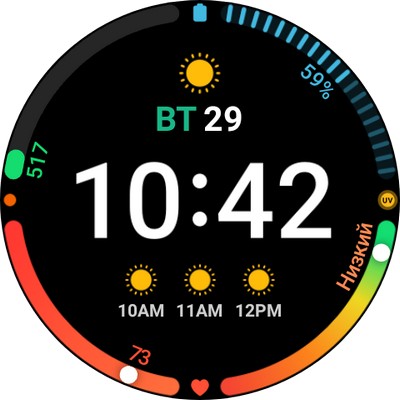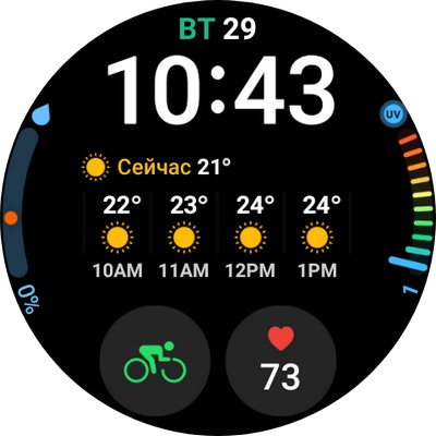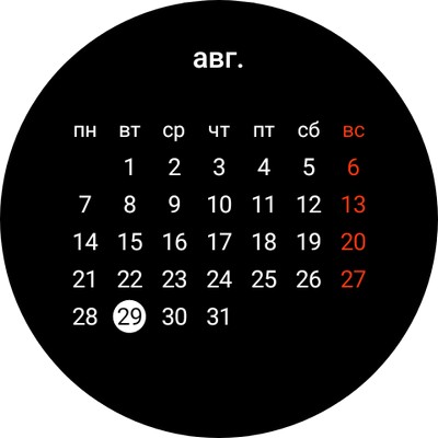 Циферблат (главный десктоп). При длинном нажатии на него появляется возможность смены циферблата и его настроек (большинство циферблатов настраиваются).