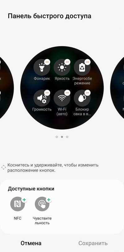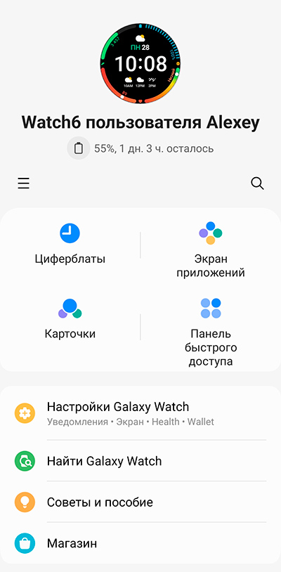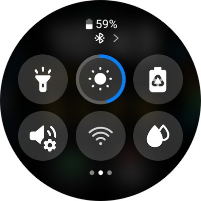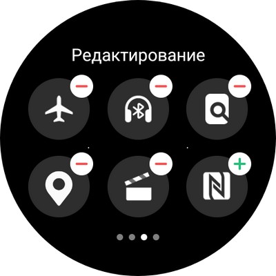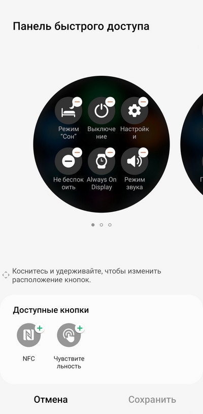 Свайп циферблата вниз - панель быстрого доступа: режим сна, выключение, настройки, отключение любых уведомлений, режим AOD , отключение звука/вибрации, фонарик, яркость экрана, включение энергосбережения, режим "в театре", Wi-Fi, очистка от воды после плавания, самолетный режим, подключение наушников, поиск смартфона, включение определения координат, NFC для оплаты, настройка звука. Быстрые переключатели - их количество и порядок следования - можно настраивать.