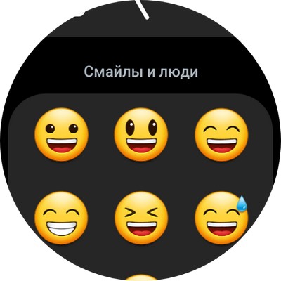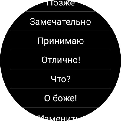Свайп от циферблата вправо - пришедшие уведомление. Список, чтение конкретного уведомления, ответ на уведомление предустановленным сообщением (они настраиваются), смайликом (их очень много в разных категориях).