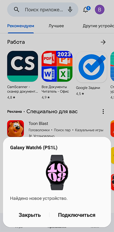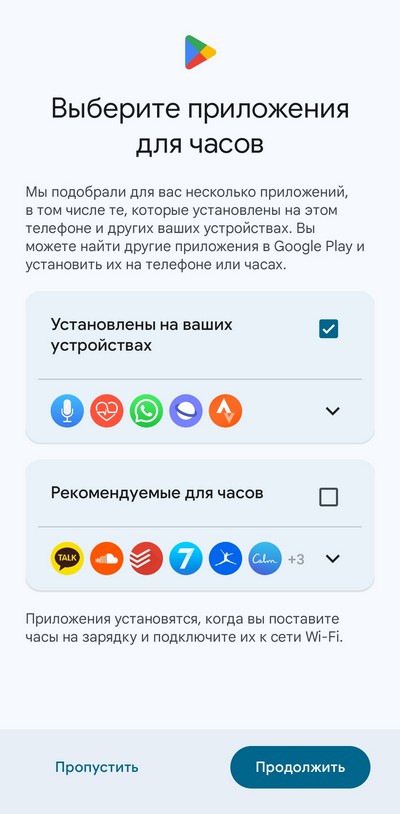 При подключении программа Wearable сразу предложит установить в часы дополнительные приложения на выбор. Страница часов.