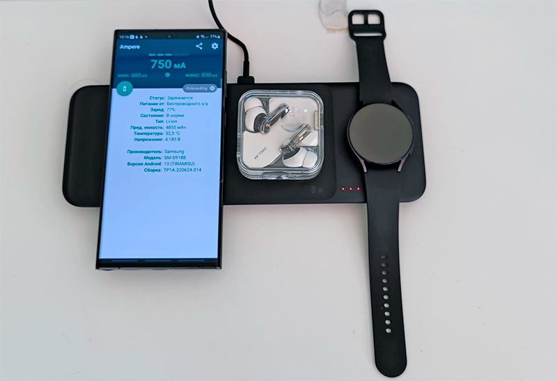 Ну и напомню, что здесь используется беспроводная зарядка стандарта Qi, так что часы можно заряжать и от других беспроводных адаптеров.