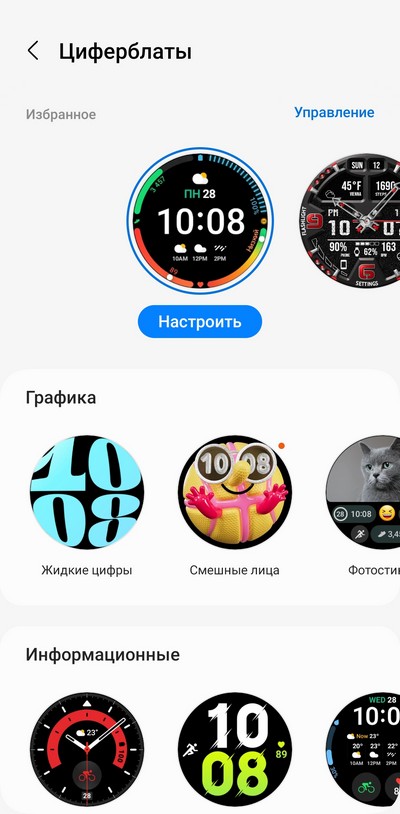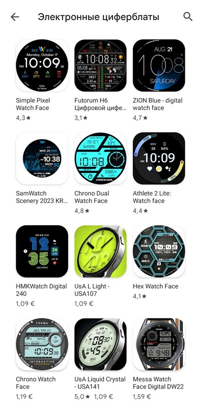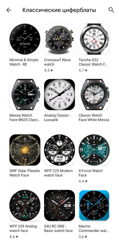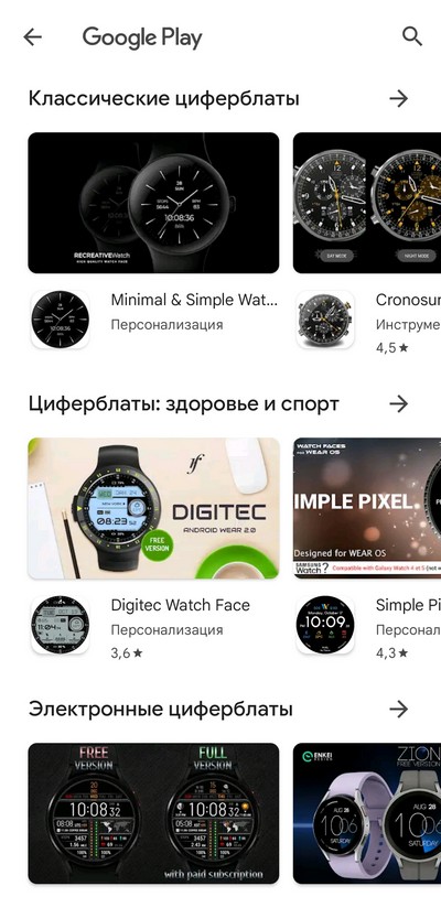 Циферблаты. Как обычно, очень разнообразные, разбитые по категориям. Практически все циферблаты гибко настраиваются, у каждого из них есть свой режим AOD. Также в Google Play немало платных циферблатов, а еще можно скачать и установить конструктор циферблатов.