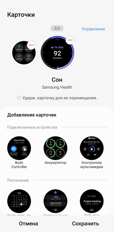 Свайп влево-вправо от циферблата - так называемые карточки: виджеты приложений, к которым нужен быстрый доступ. Уведомления, сон, количество шагов, мультитренировки - всего можно установить 34 карточки, их количество и порядок настраиваются через телефонное приложение или в самих часах.