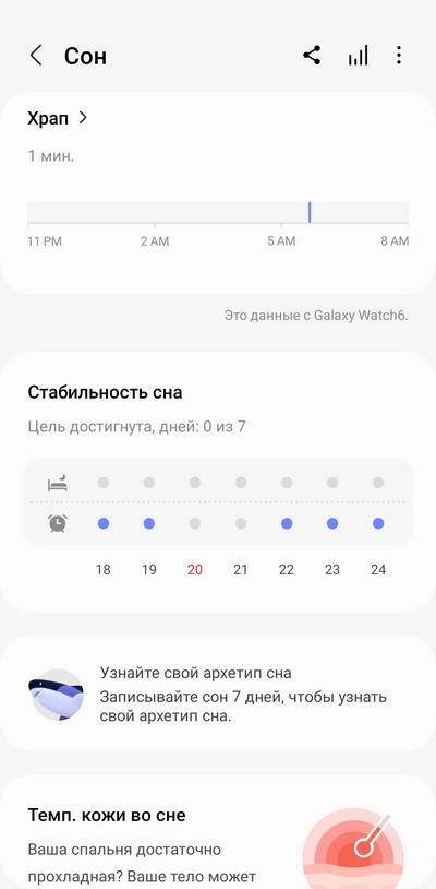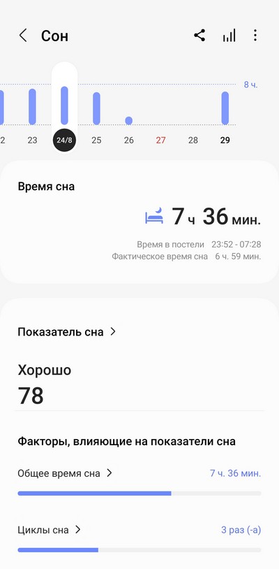 По поводу отслеживания сна. Сон часы определяли достаточно четко, однако часы не всегда определяли продолжение сна: например, проснулся в шесть утра, решил еще поспать, минут через десять заснул, а часы определили, что я в шесть уже встал, и следующий отрезок сна не засчитали. И у всех предыдущих моделей часов Samsung такое наблюдалось.