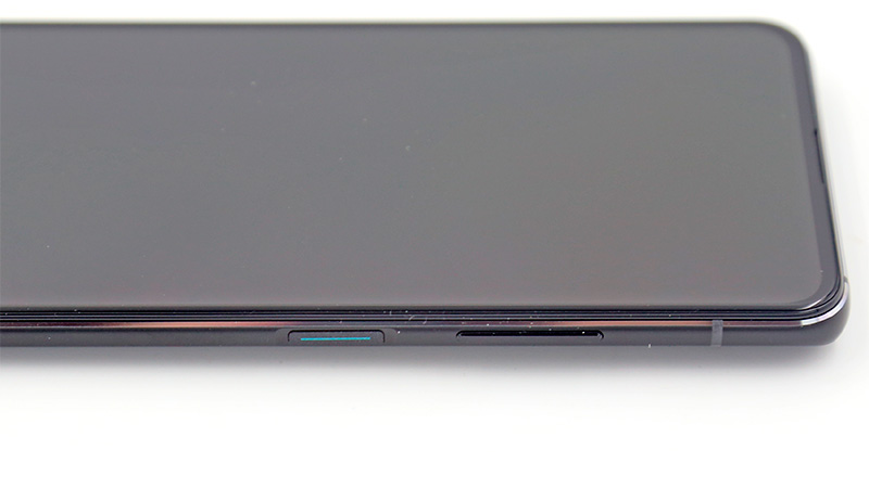 На правой грани - кнопка питания, совмещенная со сканером отпечатка пальца, качелька громкости.