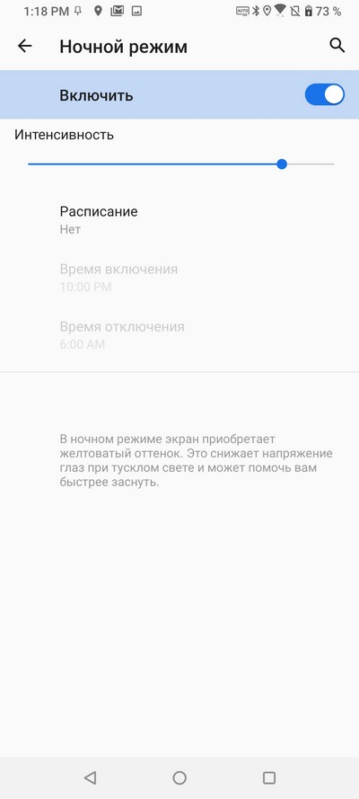 Ночной режим (в том числе и по расписанию) и скорость анимации.