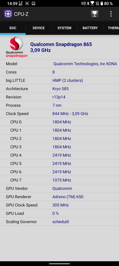 Процессор: Qualcomm SM8250 Snapdragon 865+ (7 nm+), Octa-core (1 × 3.1 GHz Kryo 585 & 3 × 2.42 GHz Kryo 585 & 4 × 1.8 GHz Kryo 585)