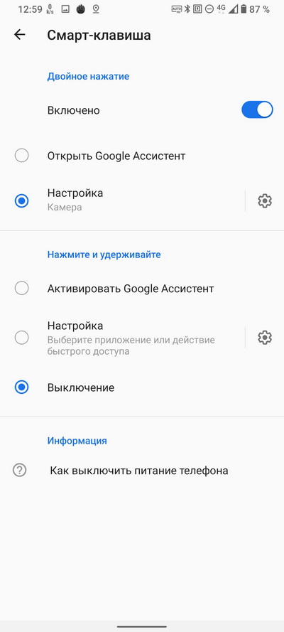 Настройки смарт-клавиши (это клавиша питания, на которую можно навесить и другие функции).
