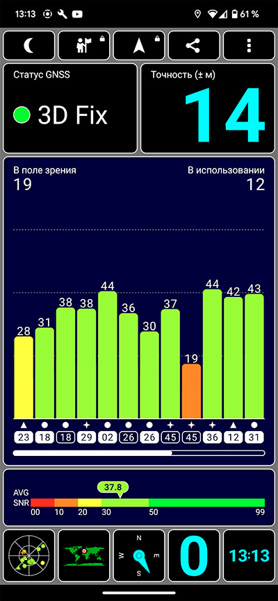 При холодном старте 12 спутников в использовании появились через четыре секунды, горячий старт происходил мгновенно, никаких проблем с навигацией не было.