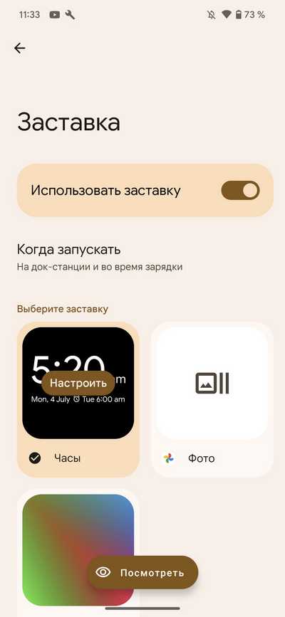 Здесь есть два вида всегда включенного экрана (AOD). Один режим - для зарядки и док-станции. Второй режим - стандартный, и его не сразу можно найти: это называется "Время и информация".