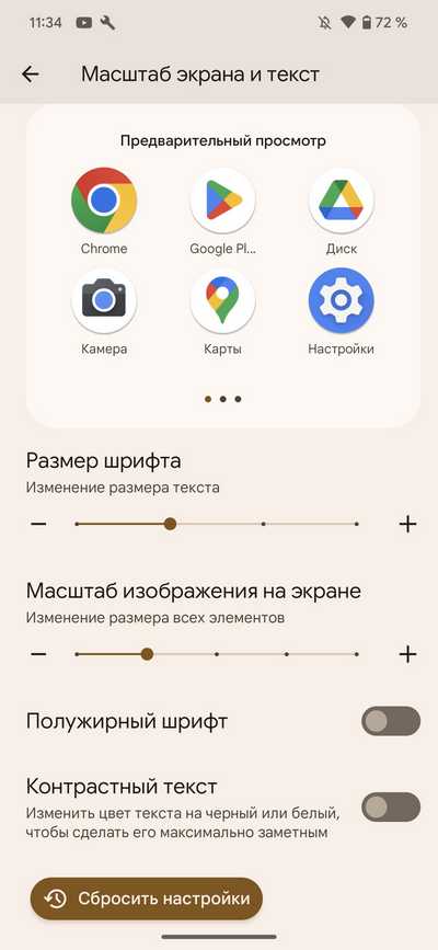 Изменение масштаба изображений и размера текста. Настройка цветов.
