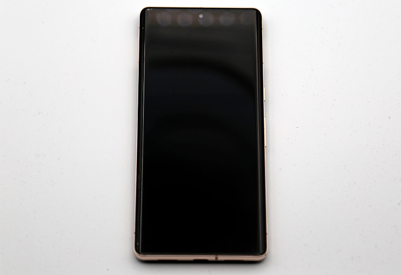 Лицевая часть. Края экрана слегка скошены, но это никаких проблем не создает. Селфи-камера расположена в отверстии по центру верхней части экрана. Дисплей покрыт закаленным стеклом Gorilla Glass Victus, рама смартфона изготовлена из алюминиевого сплава.