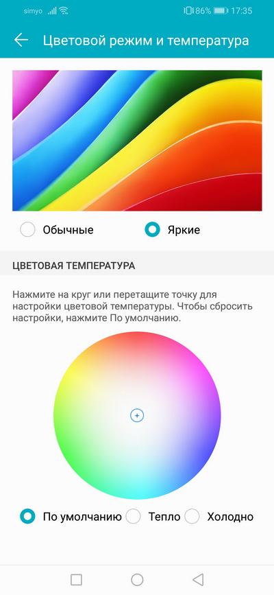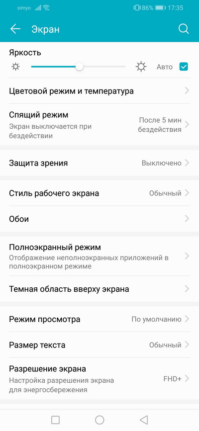 Как обычно в EMUI, у дисплея можно настраивать цветовой режим и температуру, включать защиту зрения для слабых условий освещения, менять размер текста и менять режим отображения "моноброви".