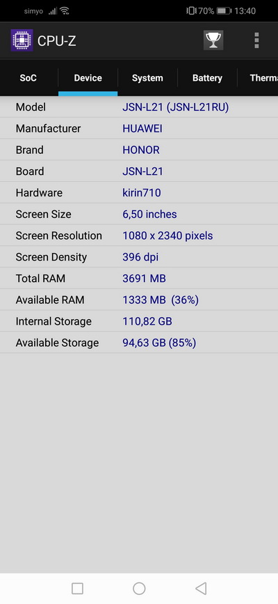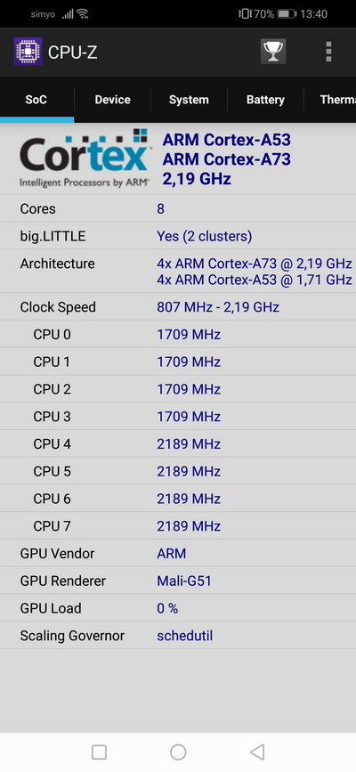 Процессор: Kirin 710, 8-ядерный, 4 × Cortex A73 2,2 ГГц + 4 × Cortex A53 1,7 ГГц