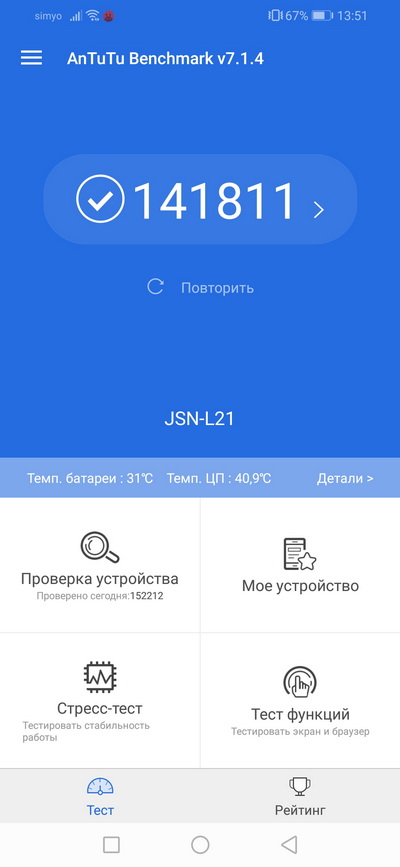 Быстродействие по AnTuTu. У Huawei P20 Lite - 67 тысяч.