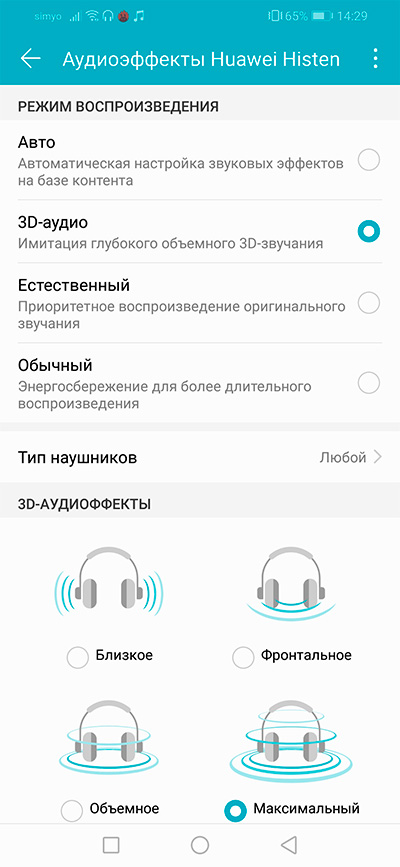 Здесь есть аудиоэффекты Huawei Histen. Попробовал разные варианты с наушниками-полноразмерами - интересно, да, пользоваться можно.