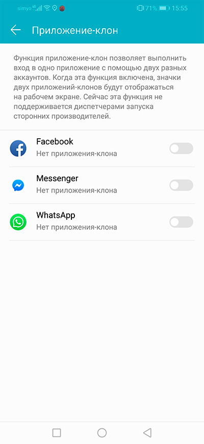 Для некоторых приложений можно сделать приложение-клон, чтобы, например, использовать две учетные записи.