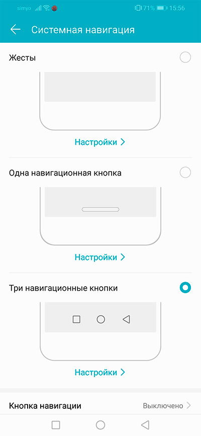 Системная навигация может быть одним из трех видов: жесты, одна многофункциональная кнопка, три кнопки.