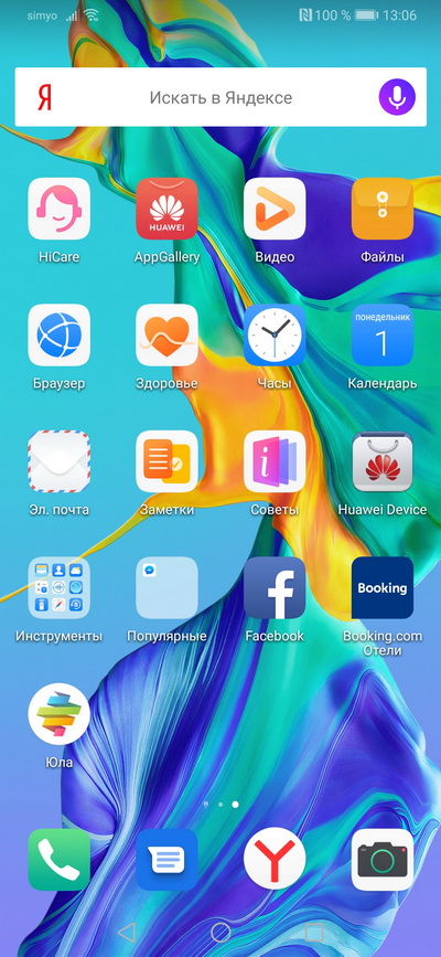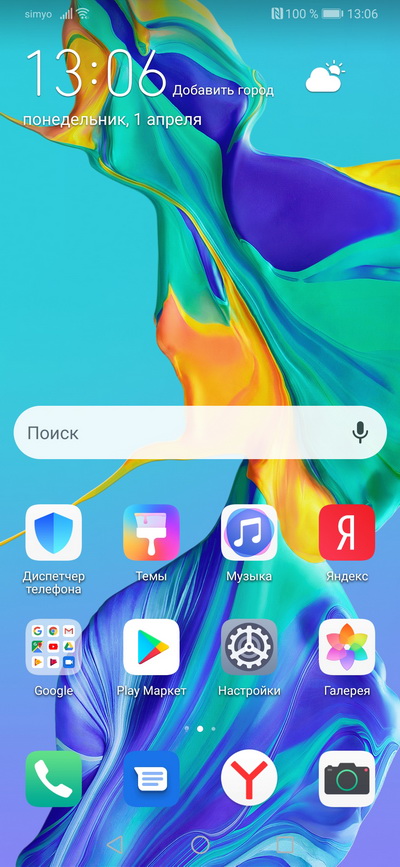 Android 9, оболочка EMUI 9.1. Главный десктоп.