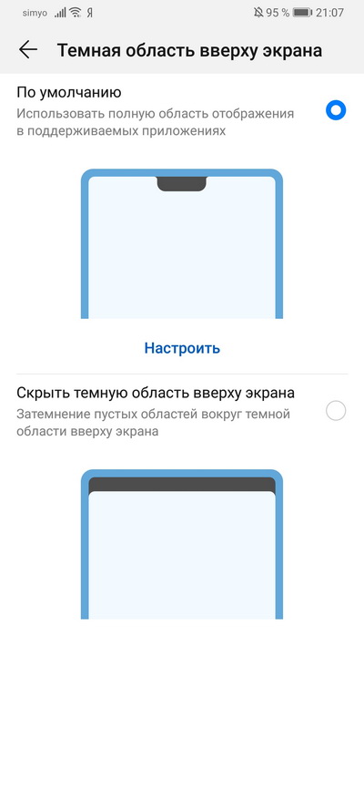 На Mate P20 Pro это означает всего лишь, что верхняя полоска становится чёрной, без цветного фона, но информация так и остаётся на ней. При этом "чёлка" становится полностью невидимой, но место совершенно не теряется.