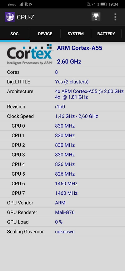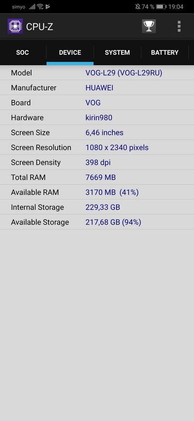 Процессор: HiSilicon Kirin 980 (7 nm), Octa-core (2x2.6 GHz Cortex-A76 & 2x1.92 GHz Cortex-A76 & 4x1.8 GHz Cortex-A55)