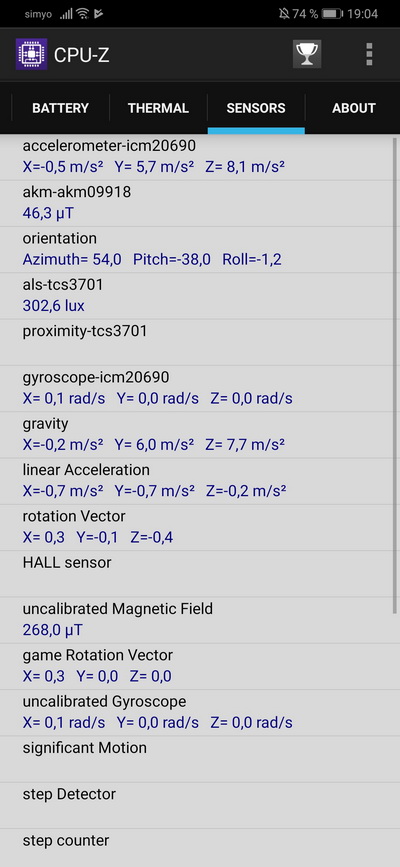 Дополнительно: датчик освещенности, приближения, гравитации, Холла, цветовой температуры, гироскоп, компас