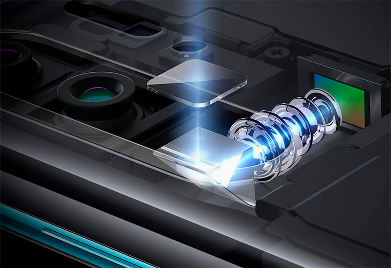 Ну теперь самое интересное. Три тыловые камеры (плюс еще четвертая вспомогательная TOF-камера). Основная, пятикратный зум, сверхширик. Пятикратная - поразительно интересная: для ее реализации инженеры Huawei придумали вот такую конструкцию с треугольной призмой, как у видоискателя зеркалок (и перископов), - чтобы не делать выдвижной объектив. Идея отличная, и ее наверняка скоро начнут использовать в других смартфонах/айфонах, но инженеры Huawei были первыми - это нужно отметить, это классная идея.