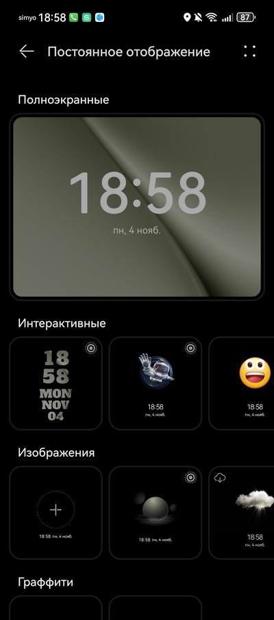Режим AOD. "Умный" режим через некоторое время экран гасит и включает при прикосновении или когда вы смотрите на экран. Но можно включить режим постоянного отображения, и там много всяких вариантов.