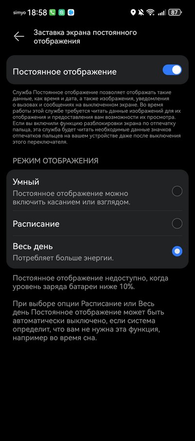 Выберите опцию «По расписанию» и укажите время начала и окончания работы AOD. Это позволяет, например, отключать AOD ночью для экономии заряда батареи.