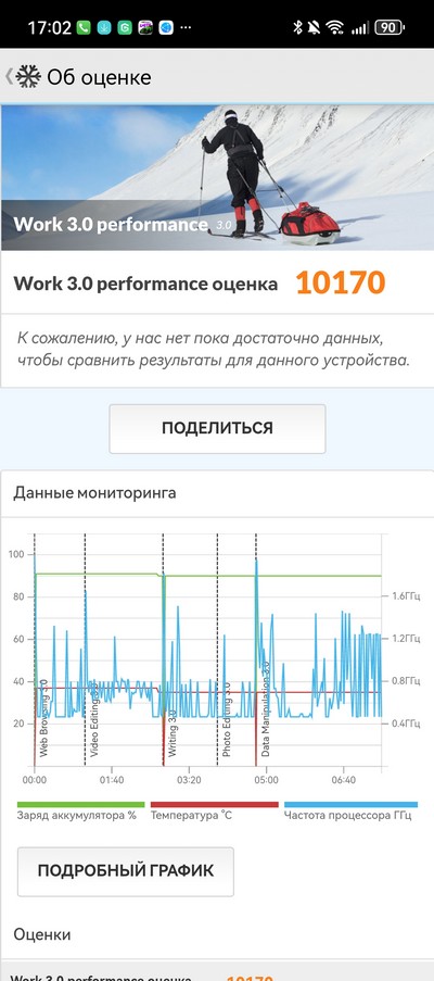Синтетический тест PCMark на этом смартфоне не прошел: вырубался через некоторое время после запуска, такое бывает. В таблице батарейных тестов PCMark этого смартфона нет, по моим ощущениям данный тест показал бы порядка 16-17 часов, что хорошо.