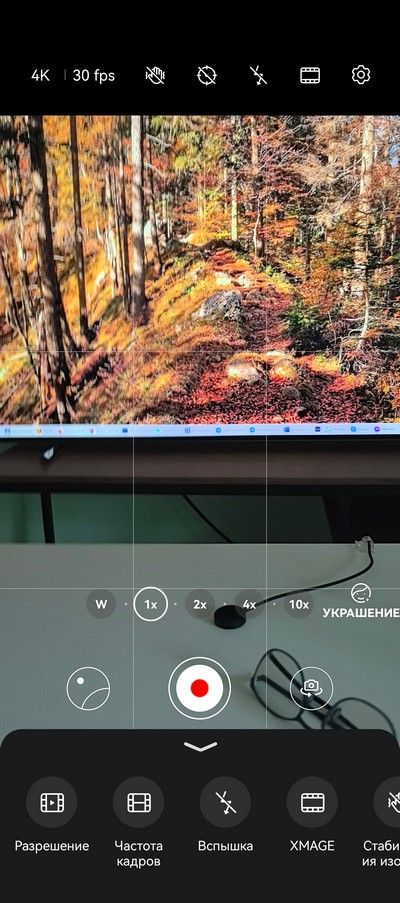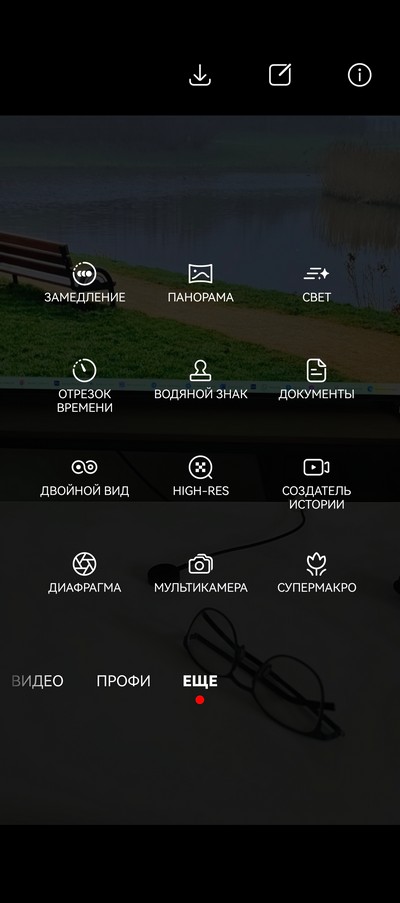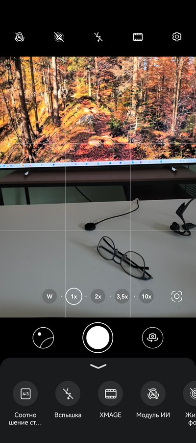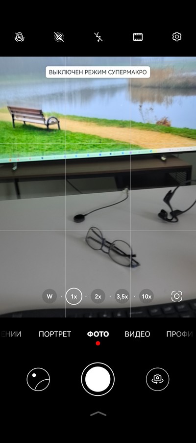 Интерфейс камеры. Снизу идут режимы, кнопка съемки, переключение между основной камерой, сверхшириком, двукратным цифровым зумом, длиннофокусником и цифровым 10-кратным зумом. Сверху - настройки. Также дополнительные настройки выдвигаются снизу.