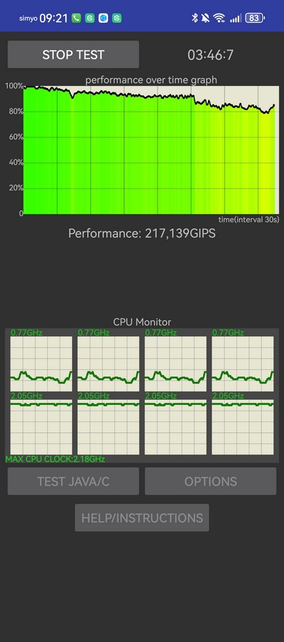 Тест на троттлинг прошел вот таким образом: поначалу производительность падала очень незначительно, потом постепенно упала процентов на двадцать, но так и держалась, ниже не падала. Так что с троттлингом тут все в порядке. Нагрев задней крышки в районе процессора при этом наблюдался очень незначительный, никак не выше 40 градусов.
