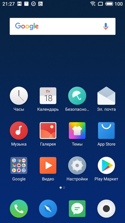 Android 7.1, оболочка Flyme OS. Главный десктоп и установленные в системе приложения.