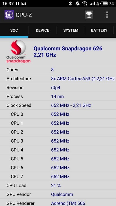 Процессор: Qualcomm Snapdragon 626, 8-ядерный