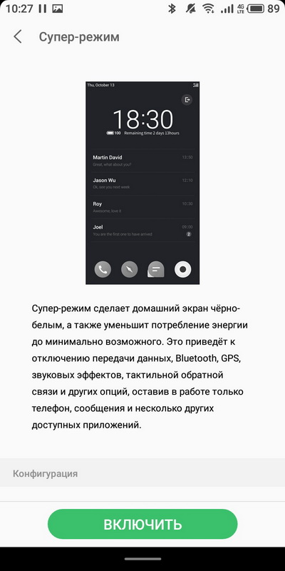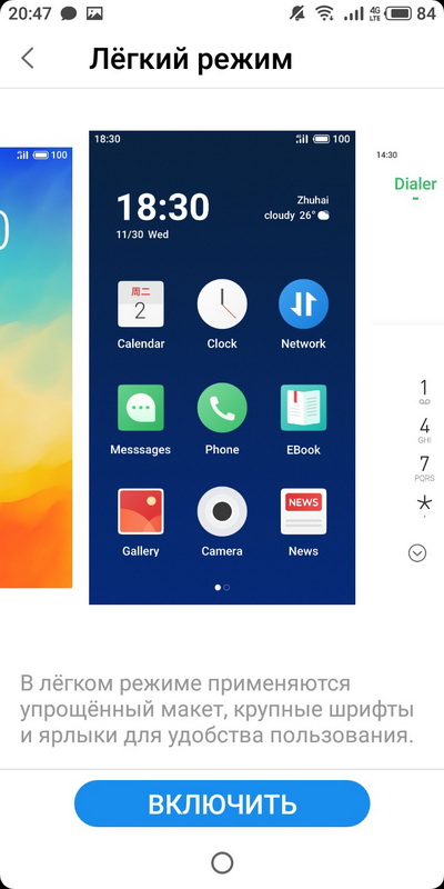 Также здесь можно включить специальный "Легкий режим", который хорошо подходит пожилым людям и тем, у кого проблемы со зрением. Я подробно этот режим данного смартфона рассматривал в статье "Смартфон для пожилого человека".