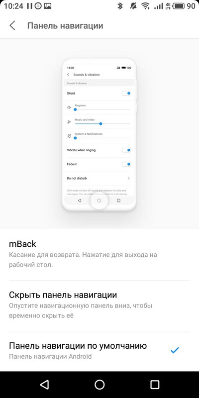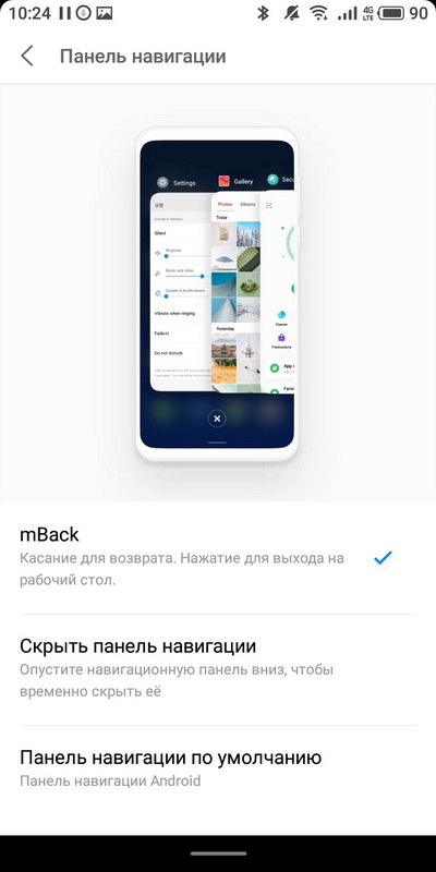 Во-вторых, вместо этого можно выбрать навигационную кнопку mBack, которая будет работать следующим образом: короткое нажатие - возврат, нажатие с удерживанием - домашний экран, длинное нажатие - выключение экрана, свайп справа от низа экрана вверх - список запущенных программ.