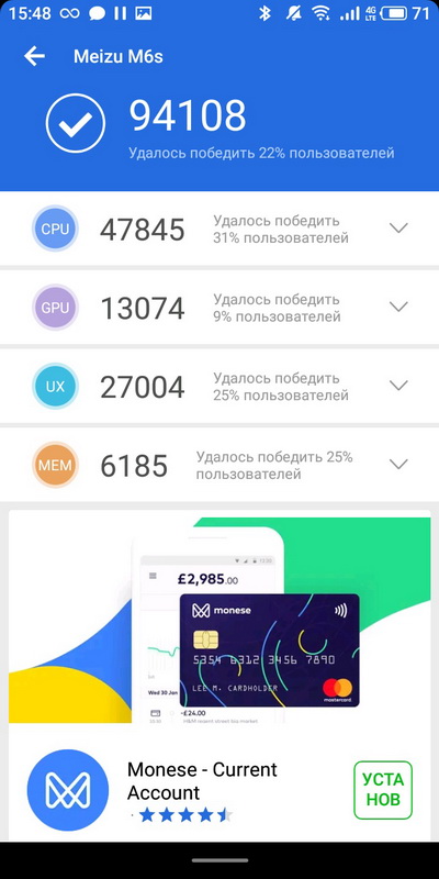 Тест AnTuTu. Под сотню "попугаев" - очень даже. Например, у Huawei P20 Lite, который в полтора-два раза дороже, - 67 тысяч.