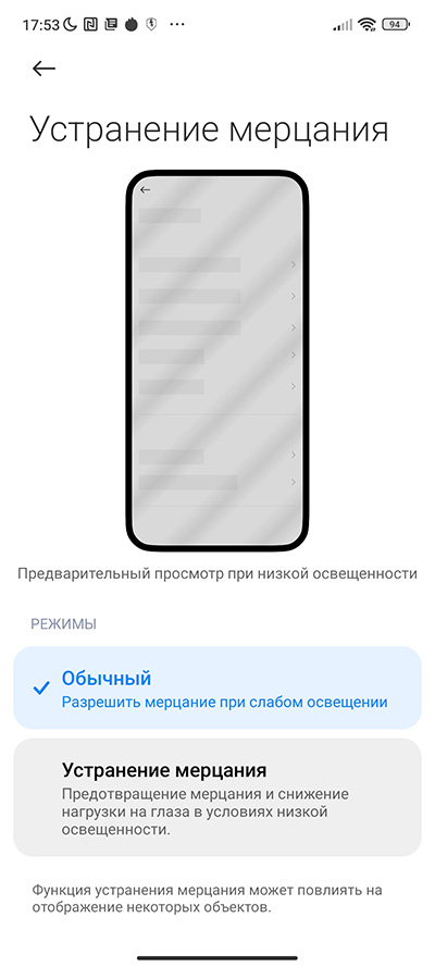 Из нестандартного - появился режим устранения мерцания, который я в смартфонах Xiaomi, насколько я помню, не встречал. Из неприятного - режим активного экрана эти идиоты (другого слова просто не подберешь) зачем-то зарезали до 10 секунд - так же, как и у Redmi, - чем вообще наличие этого режима как такового сделали совершенно бессмысленным.