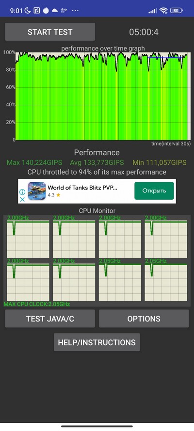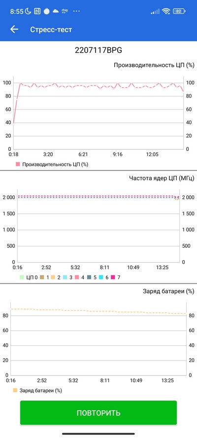Стресс-тест. Температура батареи не превысила 40 градусов - хороший результат.
