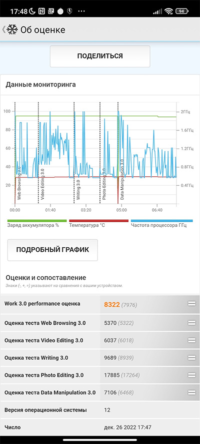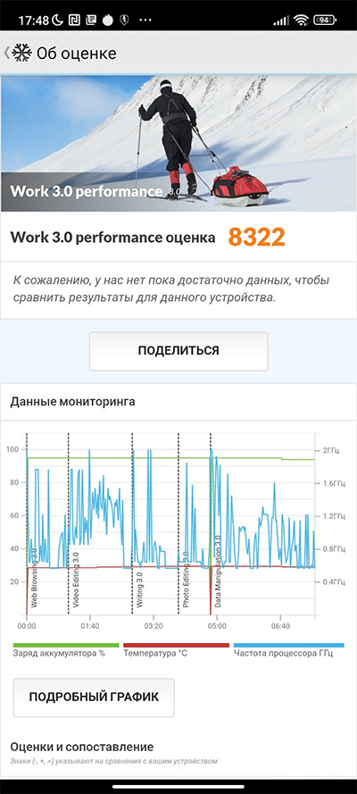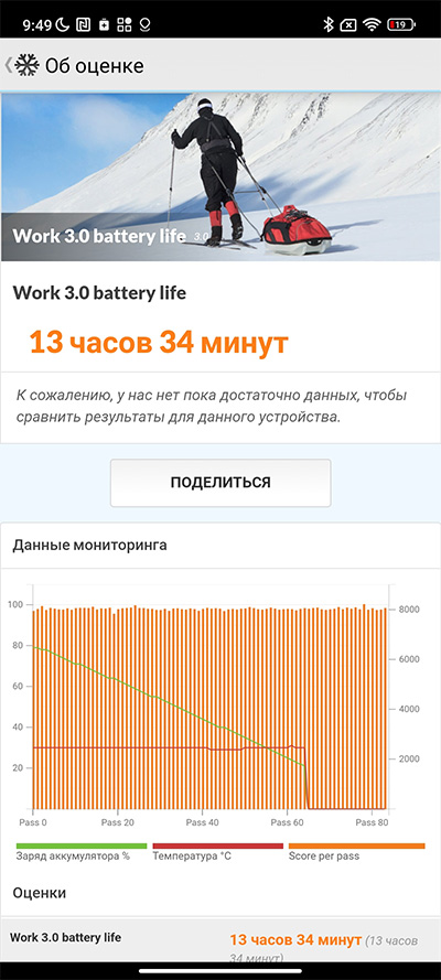 Синтетический тест PCMark. Хороший результат: под серьезной нагрузкой смартфон продержится почти сутки.