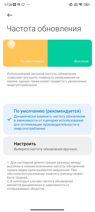 Настройки цветовой схемы и частоты обновления дисплея.