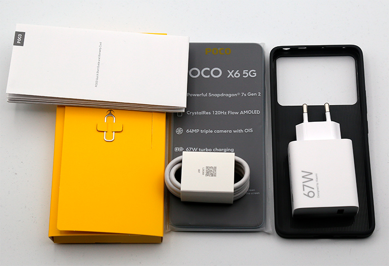 Комплект, как обычно, самый полный - это вам не Samsung: смартфон, адаптер питания на 67 Вт, кабель USB - Type-C, силиконовый чехол, инструмент для вытаскивания вставки под сим-карты, руководство пользователя. Правда, наклеечки перестали прикладывать, а раньше прикладывали. Но мне трудно представить пользователя, который будет лепить наклейку POCO - например, на свою машину, как это нередко делают владельцы айфонов.