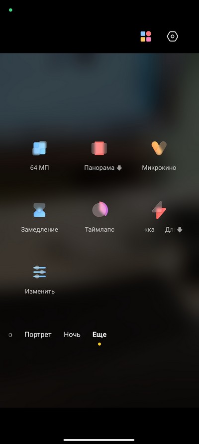 Интерфейс камеры. Снизу переключаются режимы: профи, документы, видео, фото, портрет, ночь и еще (набор настраивается). Выше переключение между сверхшириком, основной камерой и цифровым зумом (по умолчанию 2-кратный или 4-кратный, но можно вызвать линейку зумов и масштабировать до 10-кратного). Сверху - пиктограммы различных переключателей и пиктограмма меню.  На правом скриншоте - окно меню с настройками.