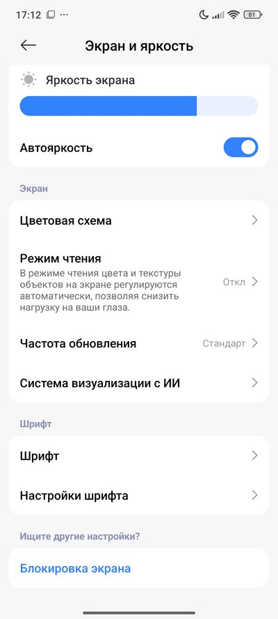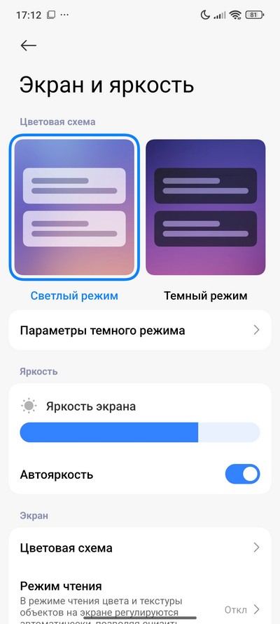 Настройки дисплея. Есть светлый и темный режимы, режим чтения (теплые цвета), настраиваемый по расписанию.