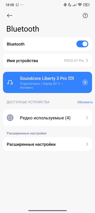 Для проверки беспроводного звучания подключил наушники Soundcore Liberty 3 Pro. Наушники подключились по кодеку AAC. Качество очень хорошее - неплохие для затычек басы, уверенная середина, детальные высокие. Уровень максимальной громкости достаточный для использования на улице в шумном окружении.