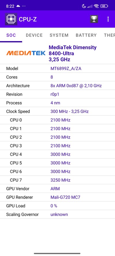 Платформа: Mediatek Dimensity 8400 Ultra (4 nm), Octa-core (1x3.25 GHz Cortex-A725 & 3x3.0 GHz Cortex-A725 & 4x2.1 GHz Cortex-A725)
