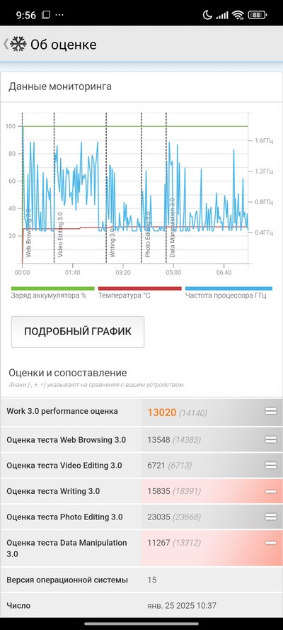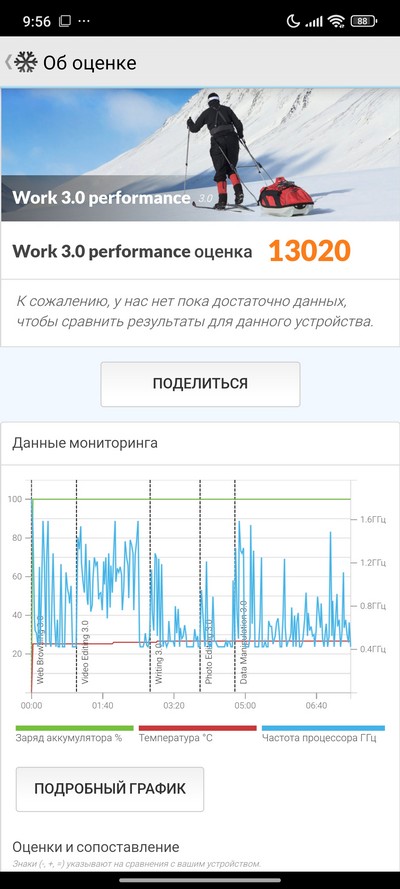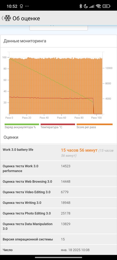 Синтетический тест PCMark. Хороший показатель, это означает, что при серьезной нагрузке весь день смартфон должен продержаться.