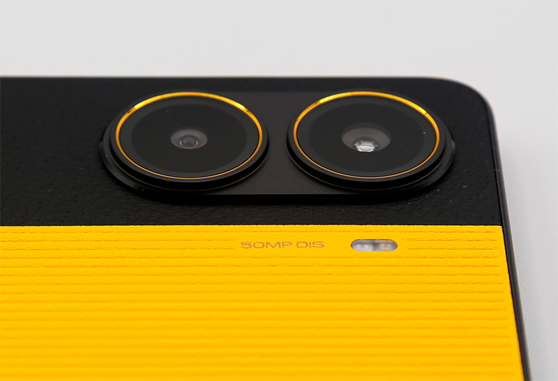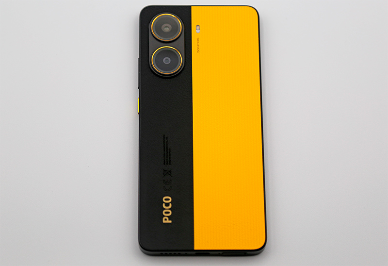 Задняя крышка - матовый пластик с интересной текстурой: левая, черная часть имеет текстуру "под кожу", правая, желтая часть, имеет текстуру из вертикальных выступающих полосок.